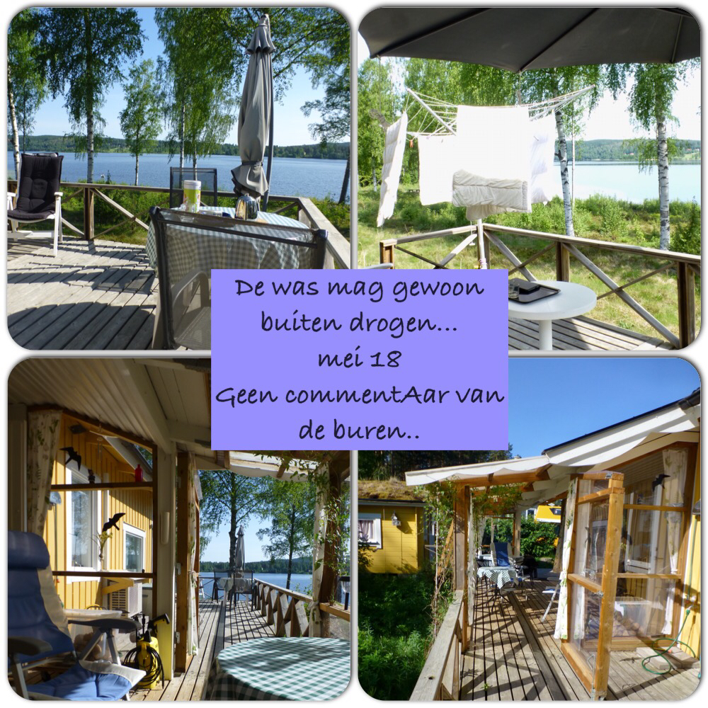 En dat pracht weer natuurlijk! Want het is warm, geen weer om bv boodschappen te doen en je huis op te ruimen. ( doen we wel hoor. In het zweet des aanschijns..zonder die domme Eva uit het scheppingsverhaal kwamen de gebraden kippen en vegetarische schijven zo aan gevlogen..) ..maar ja...).’ Met een kopje koffie,een pilsje,een glaasje wijn op de veranda zitten is onze voornaamste activiteit. . Een boek lezen, zien hoe het koolmezenpaar en de bontevliegenvangers af en aan vliegen om hun jongen eten te geven die onderdak hebben gevonden in de 2 vogelhuisjes.., na het middageten zien we de bootjes en vlotjes op het meer verschijnen. De avonden zijn lang.. om half 11 zijn de mensen die in de buurt een miljoen denneboompjes planten nog aan het vissen